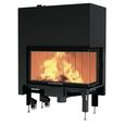 Угловая дверца из жаропрочной стеклокерамики со вставкой стекла справа увеличивает обзор на пламя и горящие дрова.