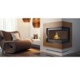 В распашную угловую дверцу справа вставлено Г-образное стекло из жаропрочной стеклокерамики Robax®, которое увеличивает обзор на игру пламени из-за отсутствия чугунной стойки. Каминная топка предназначена для установки в колонну, во внешний выступ перегородки или на специальный подиум.