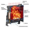 Конструкция печи включает в себя топку с пламегасителем и каналом вторичного дожига. Стенки топки выполнены из металлических труб, являющихся эффективными конвекторами. За счёт такой конструкции значительно ускоряется прогрев помещения, повышается эффективность сгорания топлива.